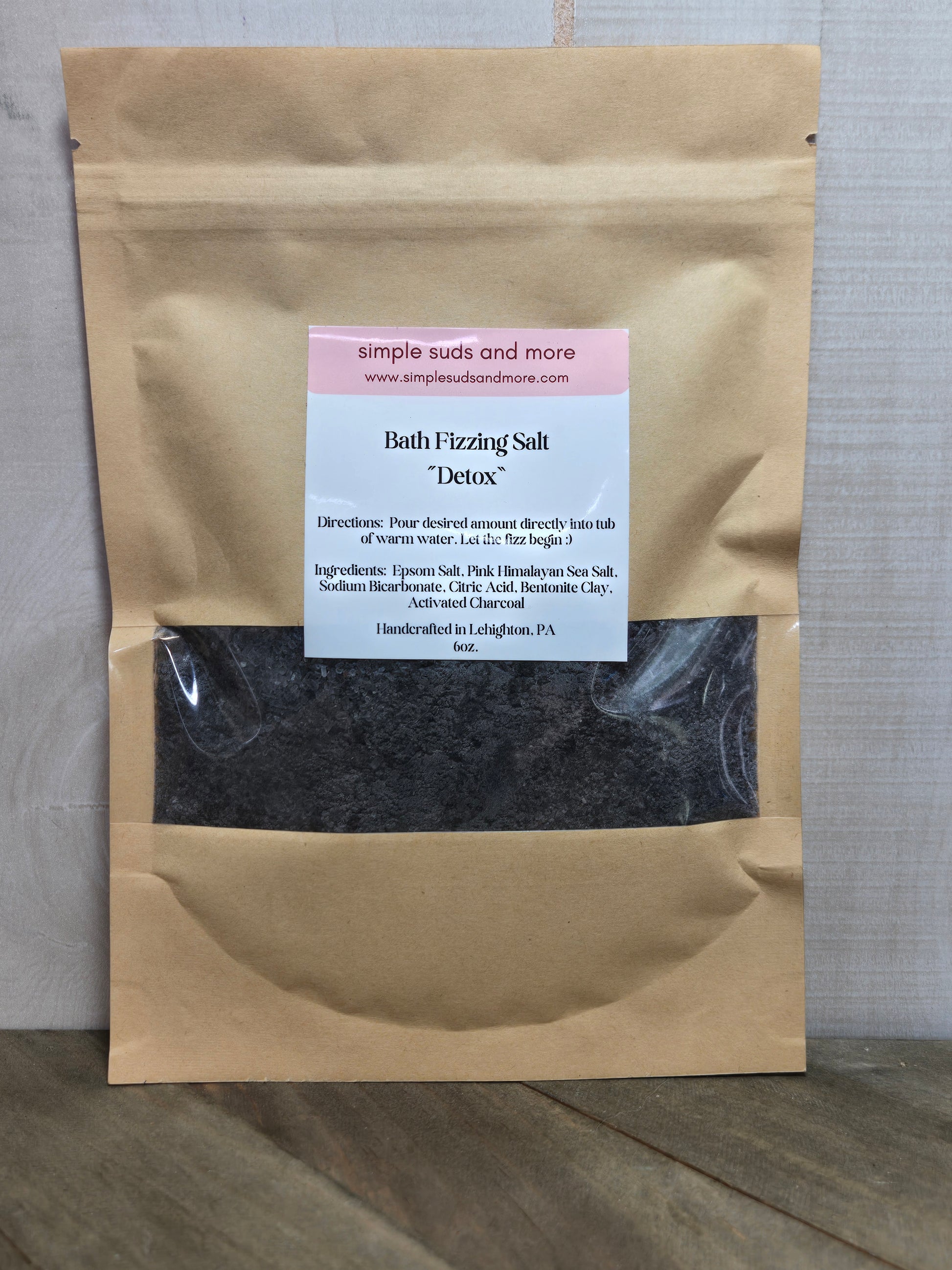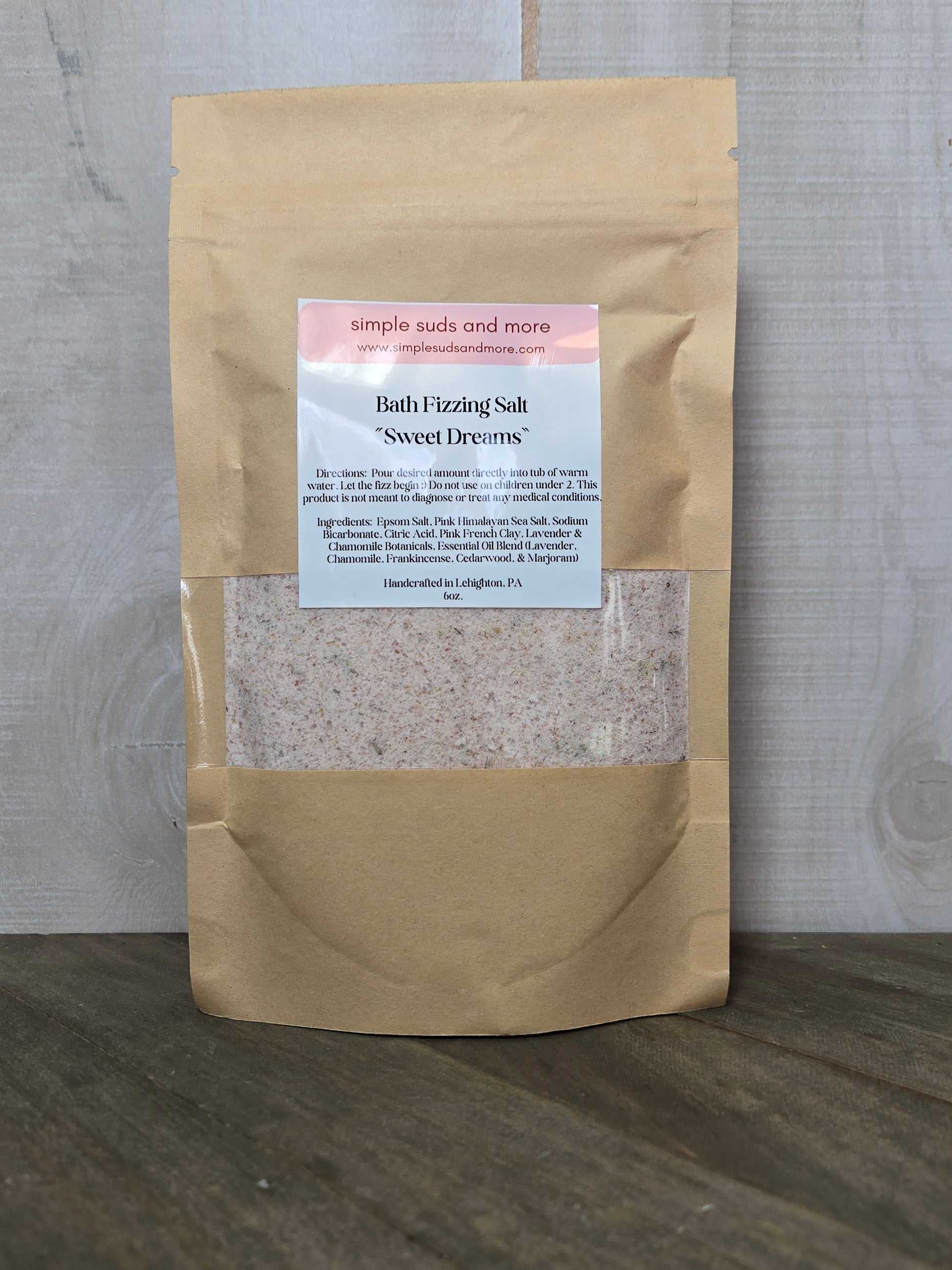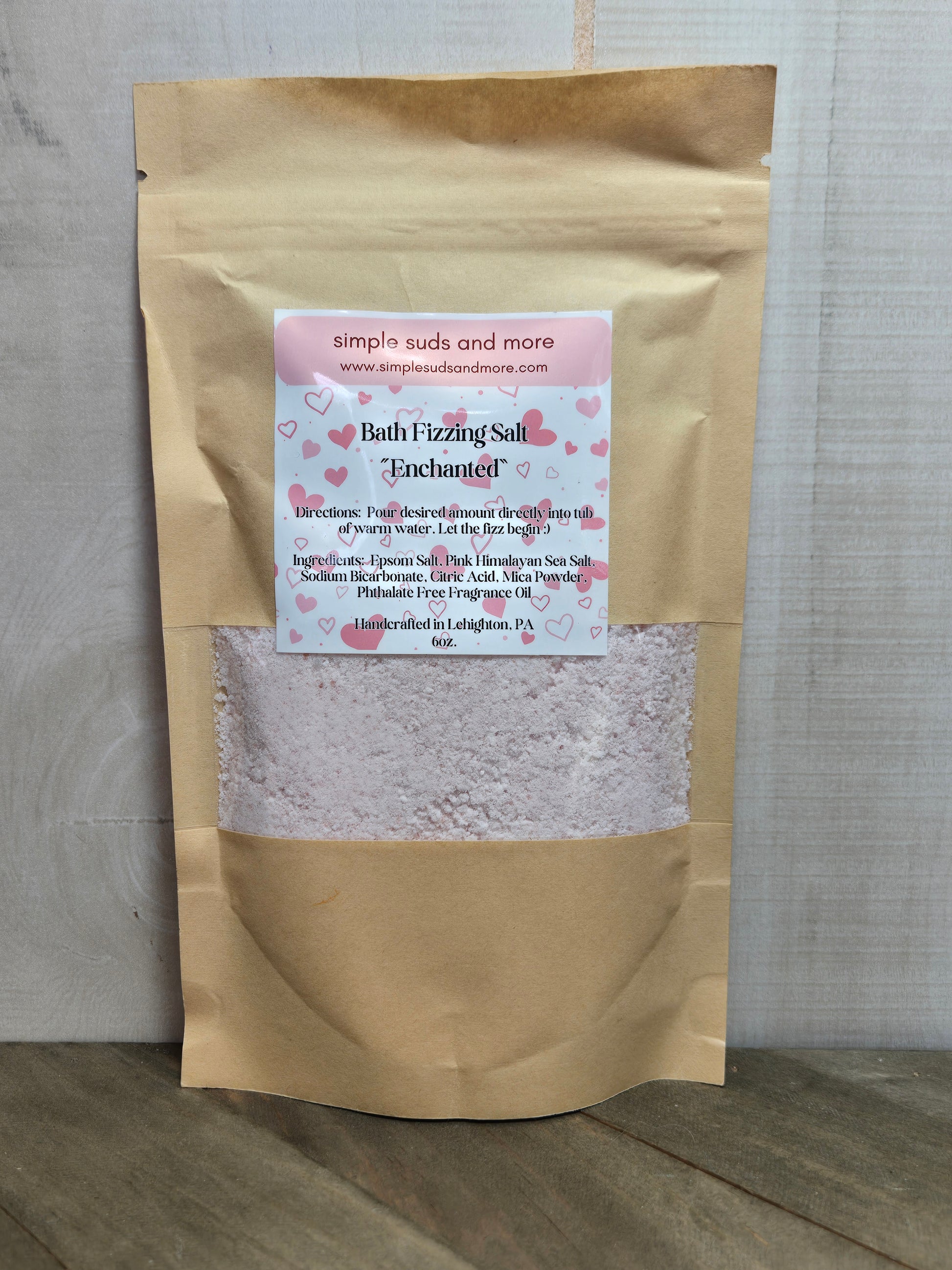 Ingredients: Epsom Salt, Pink Himalayan Sea Salt, Sodium Bicarbonate, Citric Acid, Mica Powder, Phthalate Free Fragrance Oil